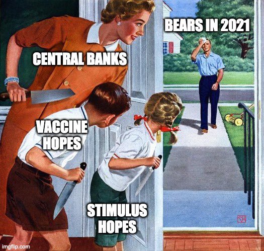 年が明けると昨年の間に高値警戒感を感じても税金などで利食いたくなかった投資家が年初一番から売ってきた。また1/5のジョージア州補欠選挙を前にブルーウェーブを改めて警戒が入った。大統領選の時もそうであったが、基本まだ日柄がある間は心配する必要がなく、一方大した調整もないままイベントが近くなるとさすがに不勉強すぎる参加者を一回振り落とし、イベントを通過した後に買い直すという流れが続いている。イベントの直前の高値では一回売ってイベントで結果の如何によらず買い直す、というのはざっくり2016年Brexitから続く正解であり、次回いつになるのか分からないが次回の政治イベントの時も似たような動きになりそうである。
