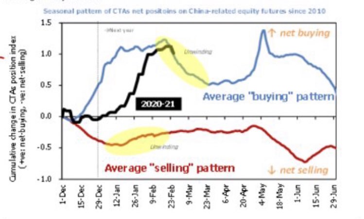この動きは過去のパターン通りである。中国本土の投資家から見てもバブルから降りるのに長い春節休みはよいきっかけとなる。休んでいる間に上に持っていかれる心配もどう考えても限定的である。野村クオンツによるとCTAの中国関係株ポジションの2010年以来の平均的なパターンも2月中旬をピークに利食いに回っている。