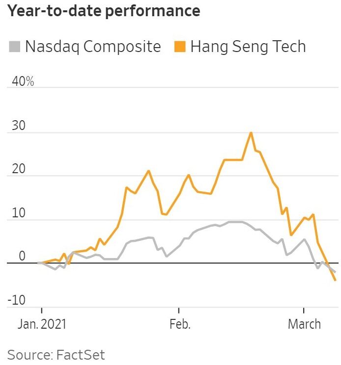 年初からナスダック以上の騰勢を見せていた香港上場の中国テックがクラッシュしている。ナスダックの高ベータ版といえばそれまでだが、年初はすべてに楽観的になった米国投資家から海外の株を買い漁る動きがあり、中国本土からも香港株を買い漁る動きが続いたが、旧正月休み前後にこの動きは反転した。後者に関しては香港で印紙税が導入されるとのヘッドラインがきっかけになった。