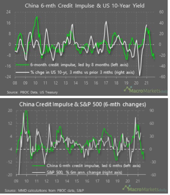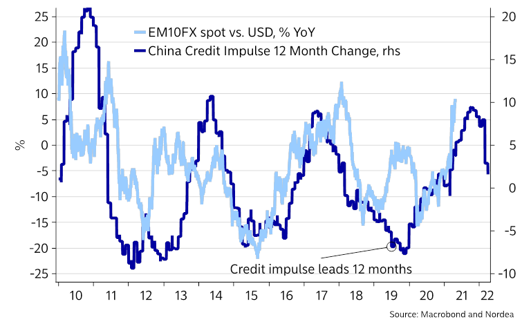 中国のクレジットインパルス伸び率の急減速が至るところで話題になっている。ノルデアが取り上げたように、中国クレジットインパルスの前年比は急激に落ち込んでいる。クレジットインパルスの算出方法は今ひとつ再現しづらいが、一般的に官民双方への新規融資のGDP比とされている。中国の経済成長の資金源が債務調達に依存する以上、クレジットインパルスは成長の勢いを規定する。足元の世界景気回復のうちどれくらいが中国の景気回復に頼っているかは分からないが、少なくともリーマンショック後からコロナ前までの10年間にわたって中国クレジットインパルスはグローバルマクロの母であり続けたようにすら見える。ノルデアによるとクレジットインパルスはグローバル製造業PMIをもエマージング為替をもリードする。