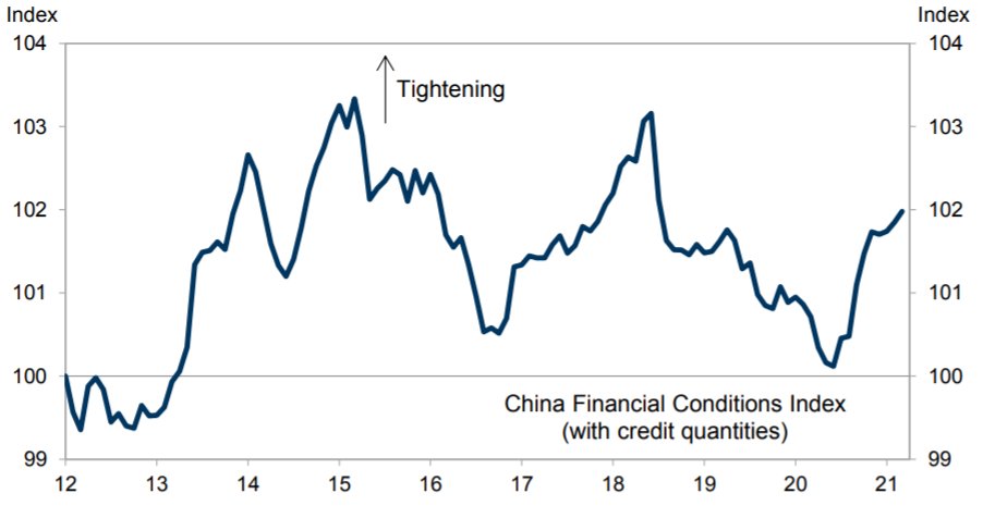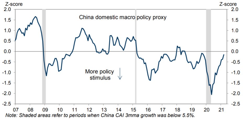 残念ながら出典不明となってしまうが、中国の金融ストレス指数も2020年の緩和を経て再び引締め方向に向かっていることは間違いない。マクロ政策も刺激後退に向かっている。
