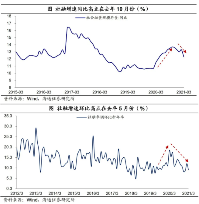 このクレジットインパルスの崖はどこまで本物なのか。融資及びその他のシャドーバンクや陽が当たる資金調達を含めたものであり、概ねクレジット供給とシンクロすると思われる社会融資総額(TSF)のピークは、前年同期比では昨年11月、前月比(3ヶ月移動平均) では昨年5月に観測されている。月次で見ると昨年最も厳しかった時期から戻るタイミングに当たる3月にブーストしたものの、そのブーストは3ヶ月程度しか続かず、すぐに巡航速度に戻ってしまった。足元でも低調さが続いており、コロナ対策の一時的な小さな金融緩和が終わってしまい引締めモードが戻ってきたことを示唆する。とはいえ、前月比と前年比を並べてみると、前年比で滑落が加速しているように見えるのはベース効果による誇張ではないか。とすればクレジットインパルス前年比の滑落を他の指標と並べても必ずしも先行性を持つとは限らない。