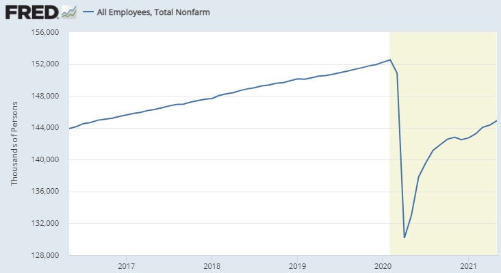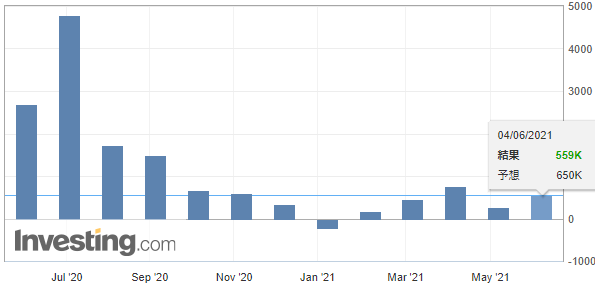 雇用者数の伸び悩みの背景としては明らかに前回の記事で取り上げた「米国の手厚い失業保険が低賃金労働と競合」が続いており、あまり不思議さはない。4月と5月で一体何が変わったと言うのか。原因が供給側にあるならば時間が経てば解決されるはずであり、実は景気の悪化を示唆しているのではないかという懸念は杞憂である可能性が高い。念のためにJOLTSを確認すると、4月分はむしろ伸びが加速している。恐らく市場参加者のNFPへの期待はJOLTSに近いのだろう。
