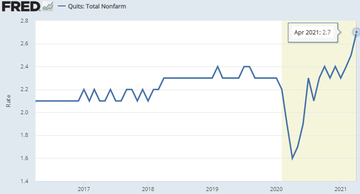 恐らく好待遇の求人が増えていることから、自発的な離職率も上昇している。コロナショック直後に労働者が職にしがみ付いていたのと対照的である。