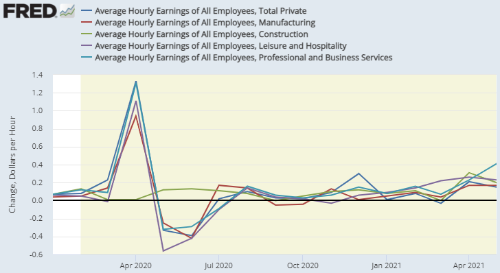 平均時給も急加速こそしていないものの伸びている。平均時給は低生産性の職が失われると上昇し、逆に低生産性の職が増えると低下する傾向もあり素直なデータではないが、業種別の数字を並べればその癖は緩和される。
