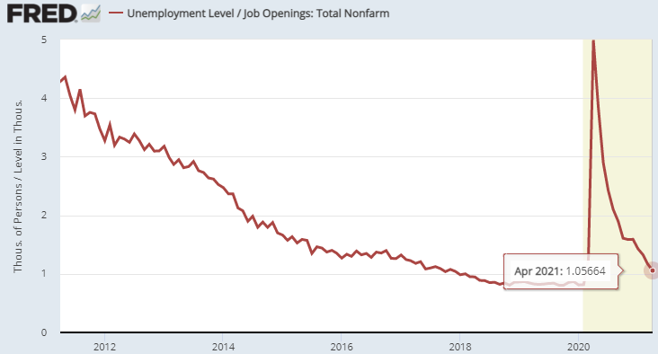 失業者は依然1千万人近く存在しているが、失業者数と求人数の比率は1.06まで低下してきた。これは選ばなければ(ミスマッチがなければ)だいたいの失業者は職を見つけられることを示唆する。この水準まで低下するのに前回の金融危機からは7年かかった。