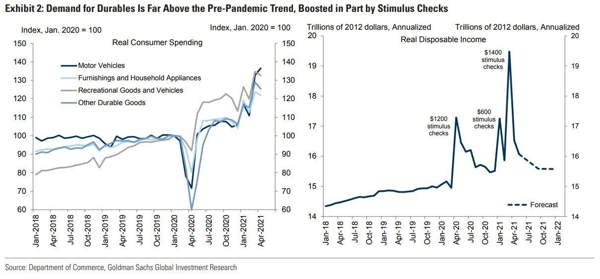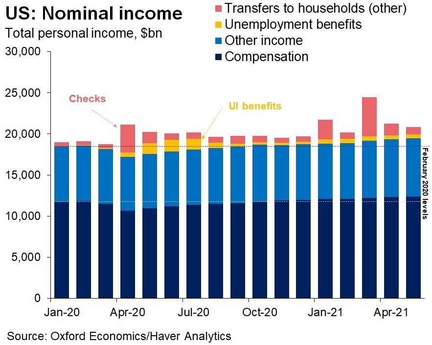 リカードの中立命題によるとばら撒きが結局増税で回収されると消費者が分かっているならばら撒きを消費に使うより貯蓄しておく行動に出やすいが、さすがにその議論はいくらなんでも時代遅れであり貯蓄率は再び低下するだろう。その上で、ここが米国であることを思い出す必要がある。Moodysによると超過貯蓄の2/3は収入トップ10%層に、3/4はトップ20%層に帰属する。富裕層はごっそり貯金を増やしたが彼らにとって超過貯蓄とは収入というより
