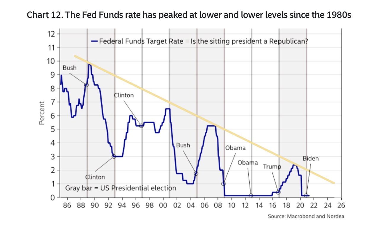 残る伏兵はCPIの4割を占める帰属家賃である。これは少々マニアックな話題になってしまいよく調べないうちに方向の予想まではできないが、ノルデアは帰属家賃は実際の家賃にやや遅行して上がっていくと主張する。今のところ、これだけは活況である不動産バブルが帰属家賃に大々的に波及している形跡はなく、CPIの帰属家賃は春にボトムを打って反発を始めているところである。この波及のタイミングを予想するのは難しいが、ここからはベース効果もあってそこそこ盛り上がると思われ、もし不動産バブルが本格的に帰属家賃に波及してCPIが高止まりした場合はこれまで議論してきた「一時的なインフレ」との扱いが異なってくると思われる。もちろんFedは不動産価格だけを引締めることにそこまで熱心ではないが、それでも「米国はもう一度不動産バブルとバーストを経験するコストに耐えられない」とも発言しているくらいなので、仮に帰属家賃主導でCPIが高止まりしたら引締めを躊躇う理由はあまりなさそう。その時に長期金利がどう反応するかは中立金利次第となるが、いずれにしても物価の議論は中期的には賃金、帰属家賃とのにらみ合いに戻るか。