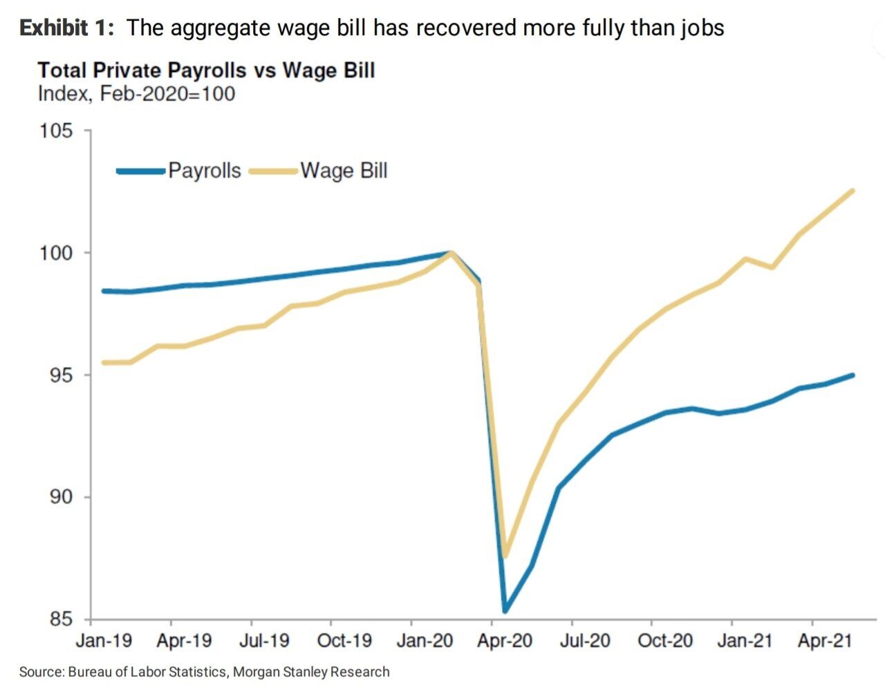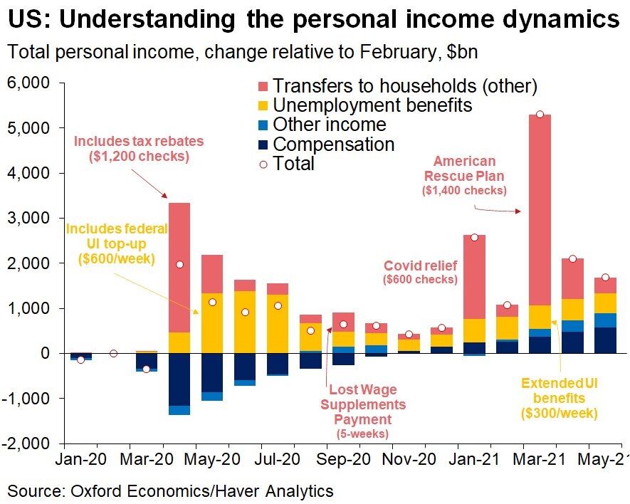 コロナショック以来、大量の労働者が失業したが、彼らの収入は潤沢な失業保険加算(黄色)と給付金(赤)によって守られ、むしろ働いていた時期よりも収入が増え、それが後のインフレ―ショナリーな経済回復の動力になったのは常識である。しかしここで触れる価値があるのは、財政支援も一過性のものであるということである。正確には山は2回あった。2020年春のトランプ政権の失業保険加算及びそれが始まるまでの繋ぎとしての素早い給付金、そして2021年春の必要だったかどうかも良く分からないAmerican Rescue Planである。失業保険加算はその山以外の期間も労働者の収入をコロナ前以上の水準に保つのに役立ってきたが、人手不足が話題になるにつれてこれから撤廃されていく予定である。