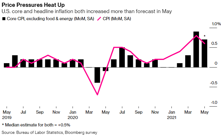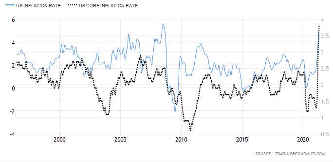 米国の消費者物価指数(CPI)はヘッドラインで見てもコアで見ても高い伸びが続いている。6/10に発表された5月分CPIは前年比ヘッドラインでは2008年以来、コアに至っては1992年以来の高い伸びとなっている。しかし、6月に入りむしろインフレ警戒は市場であまり話題にならなくなったように感じられる。長期金利はタカ派なFOMCすら無視して低下が続く。本ブログが5月に既にこの上なく明確に断言したように「足元のインフレの数字の伸びはFedの見立て通り一時的である」との考え方が広く受け入れられつつあるようだ。