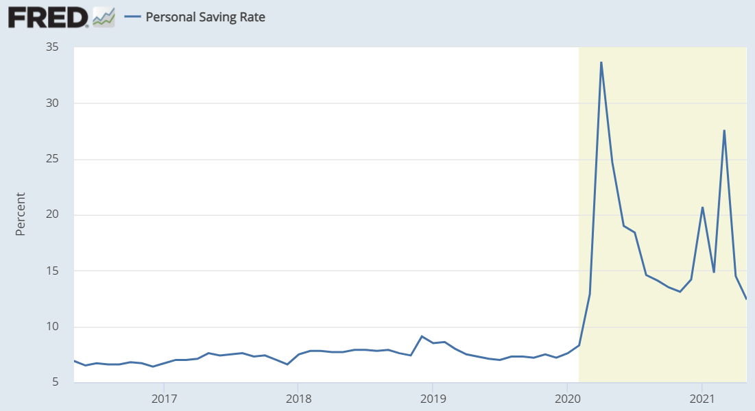 個人貯蓄率の月次推移は概ね給付金収入と似たようなスペクトルを描くが、他にも外出制限による支出減など他の要素が加わっている。そろそろこの山々も終わるという中で、どれくらいお金が貯まったか計算するにはこのスペクトルの普段との差を足し合わせていけばよい。1-Saving Rateが普段の支出なのでそれと比べると、だいたい普段の年間支出の1割強を貯めたと思われる。CNNは超過貯蓄を米国のGDPの12%にあたる2.6兆ドルと表現した。複利を無視して非常に雑に表現すると、10年間の1%ずつの追加物価上昇に対して超過貯蓄は購買力を維持できる。従って「財政出動が一時的なのでインフレは一時的に決まっている」と決め付けるのは安直すぎると言えるものの、この数字が上限となる。
