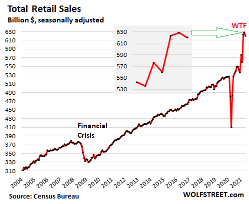 ではコロナ前と何が「一時的でない」変わり方をしたのか。ヘッドライン物価ではコモディティインフレ(が挙げられる。コア物価は米国民の購買力に依存する。そして不動産と家賃の上昇で帰属家賃が上がるかどうか。インフレ期待による慣性。足元は長かったロックダウンと給付金でできた貯金で消費が盛り上がっており、小売り売上高は面積で見てもただのペントアップという以上に伸び続けている。売れていれば値上げしても許容されるのは自然な流れに見える。