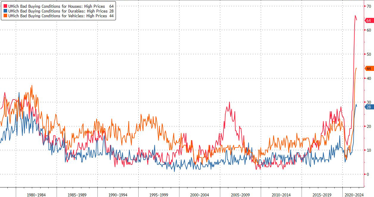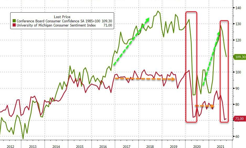 ミシガン大のサーベイは家族の財務状況、全国経済のアウトルック、そしてよく参考にされるインフレ期待などいくつか質問項目に分かれているが、せっかく分けたもののインフレ以外はほとんど同じ回答傾向となっている。失業中は手厚い給付金をもらい続け、その後のリオープンで好条件の求人が山のようにある中で、どうして消費者のセンチメントが悪いのか。