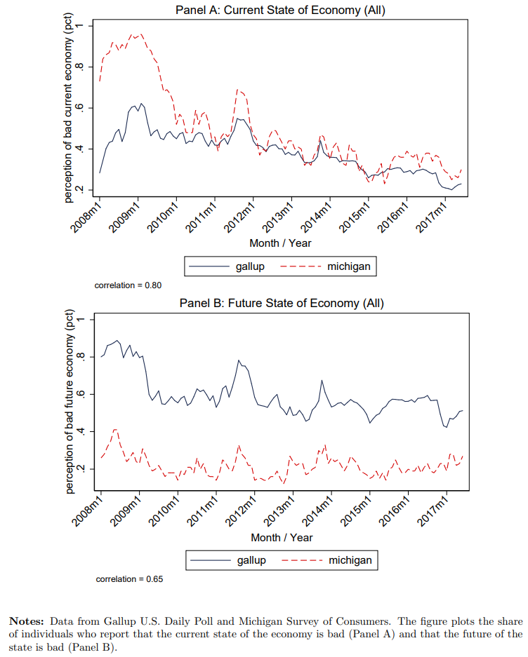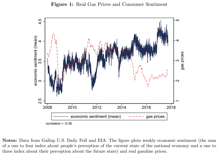 特に、米国の消費者センチメントはガソリン価格と反比例することが知られている。ミシガンより頻度が高く、またミシガンと連動も悪くないGallup US Daily Pollの週次センチメントはガソリン価格と連動する。やや古い記事となるが長期データでもミシガン消費者センチメント(Index of Consumer Sentiment, ICS)とガソリンがうっすらと逆相関にあることを確認できる。ガソリン需要は非弾力的なのでガソリン価格の上昇は消費者の可処分所得を腐蝕する。特に1970年代の記憶が残っている世代にとってインフレは悪夢である。