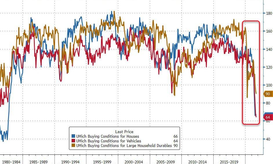 「大規模な家財道具を購入したり、家、車などのような大規模な購入をするのに適しているかどうか」という質問への回答(Buy Conditions)はインフレ期待の盛り上がりと共にリーマンショック以下の水準まで悪化している。