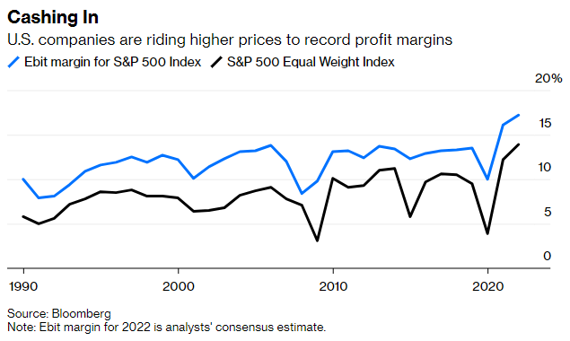 「企業収益がインフレに付いていけるか」は雑な問題提起なのでもう少し細かく分類できる。一般的にそれは企業が仕入れ価格や人件費と言った上昇するコストを顧客に転換できるかどうかによって規定される。コロナ後のインフレ局面で企業は供給制約によって値上げに「迫られた」のか、それとも「消費者のお金が余っているからとりあえず値上げした」のかはマージンで判断されるが、寡占企業GAFAMの影響をやや弱めた等ウェイトS&P 500で見てもコロナ前より厚くなっているので、後者の色の方が厚そうに見える。つまり米国で大規模な財政出動で消費者の購買余力が上がったのが先であり、全体的に企業収益はインフレ以上にインフレしたのが2021年だった可能性が大きく、インフレやコストよりもとにかく実質金利が株のバリュエーションに影響を与えたのは納得できる。