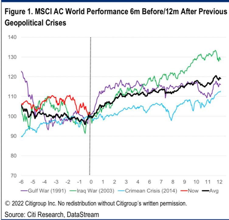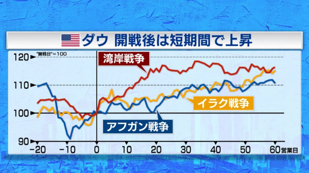 では、今回の戦争が産んだ実質金利低下もゴルディロックスに繋がるだろうか。過去のパターンでは戦争が始まるまでがリスクオフで、始まると株高になった。この現象は俗に「戦争は号砲と共に買え」「遠くの戦争は買い」と言われたりする。今回もそれに期待する向きは多かったようである。
