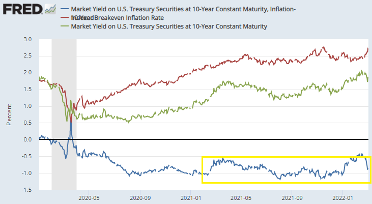 2022年に入るとFedの早期利上げ及びQTが話題になるにつれて実質金利も大きく上昇した。米国債には米国のインフレに勝つ必要のない海外からの貿易赤字の打ち返し(非駐マネー)が入って来るし、QTはまだ始まってもおらず相当の残高をFedが保有したままなので、本ブログなどは「0%は相当遠いものの、実質金利はさすがに10年▲1%割れで今サイクルの底を付けたと思われる」としていたのだが、10年実質金利は一気に▲40bpまで急上昇し、世間ではプラス域まで行く前提の議論が圧倒的となった。