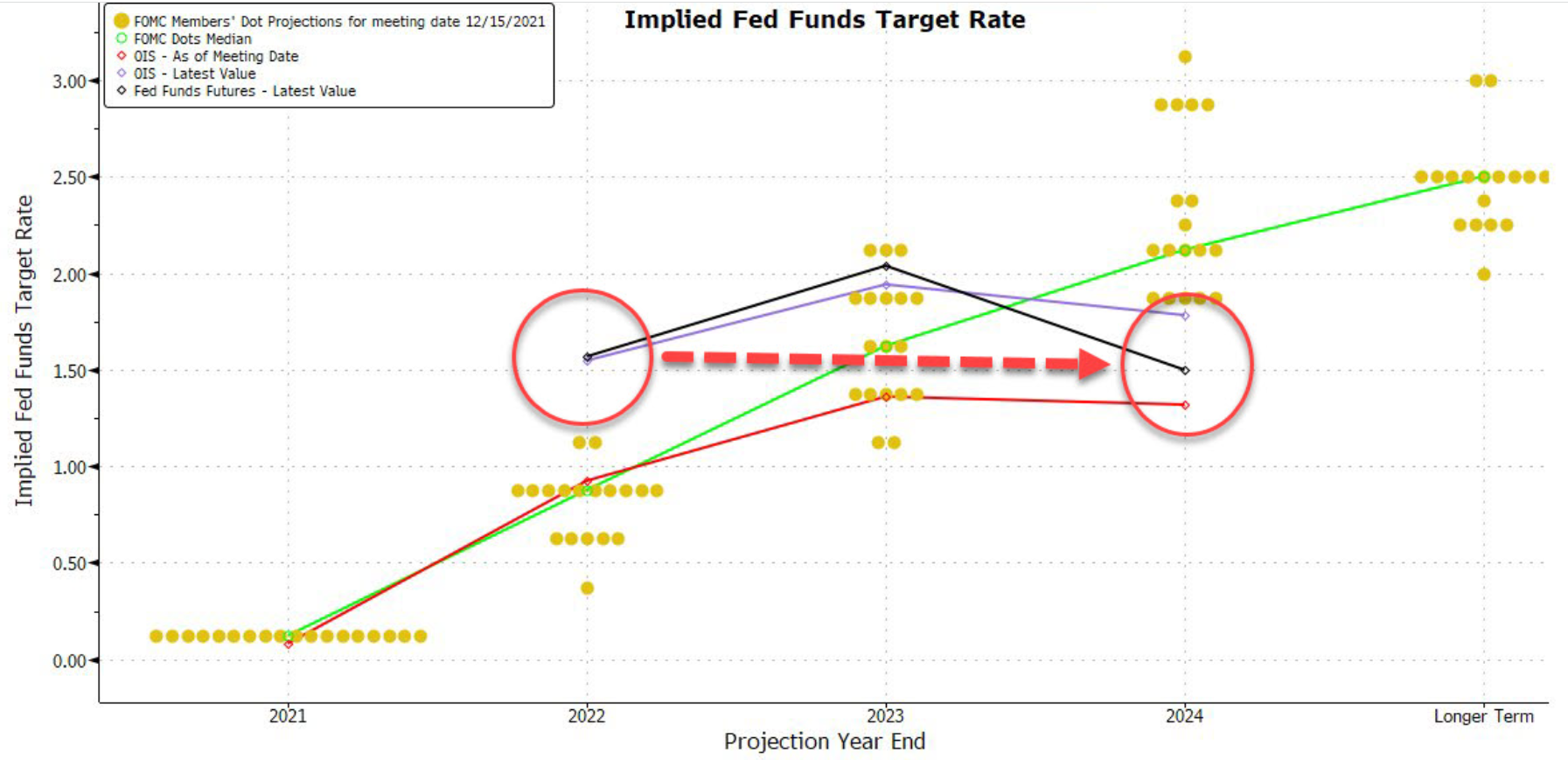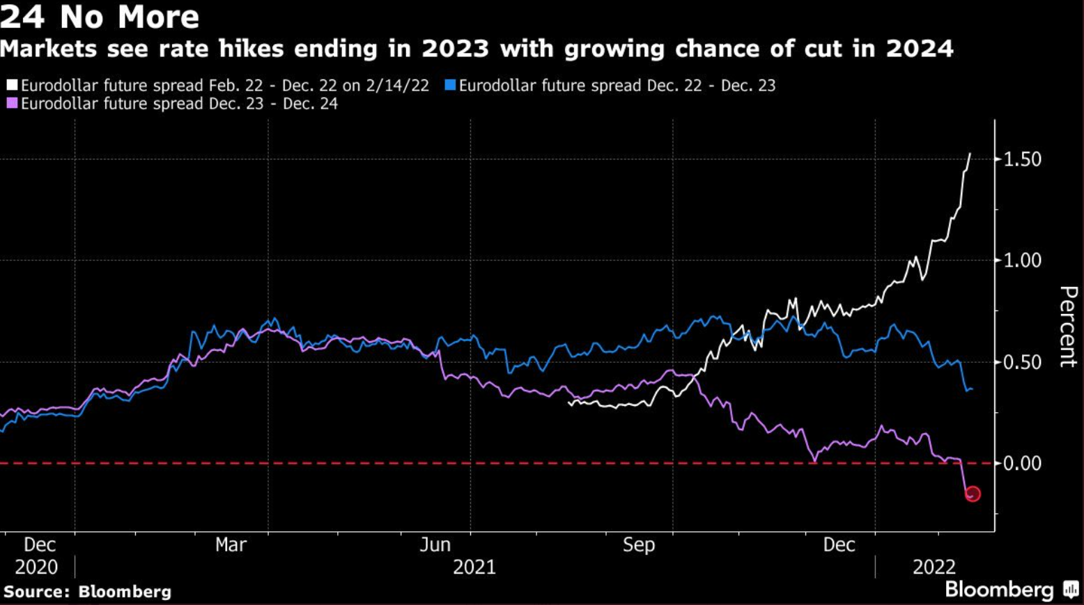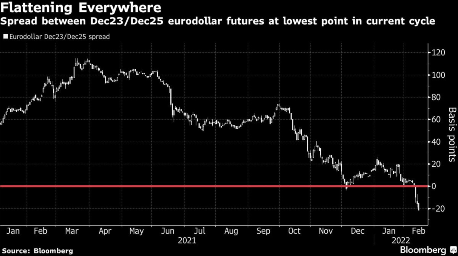 自己実現するのなら市場参加者総員で3月50bp利上げを押し込めばいいのではないかと思うものの、2月に入ってからリスクオフ局面で目立ってきたフロントエンド内のインバートはその側背を圧迫する。zerohedgeが嘲笑するように、2024年末の政策金利織込みは既に2022年末より低くなっており、2022年内の利上げ織込みで競う意義が薄れている。元より短期金利市場は流動性が高くないためオーバーシュートしやすく、それが示す数値を過度に解読しようとするのは建設的ではないが、2022年内の織込みに限れば3月25bp利上げから始まるメジャードペースは堅いボトムになる一方、緊急利上げまで意識したところが利上げ加速織込みのピークであったと考えて差し支えないだろう。