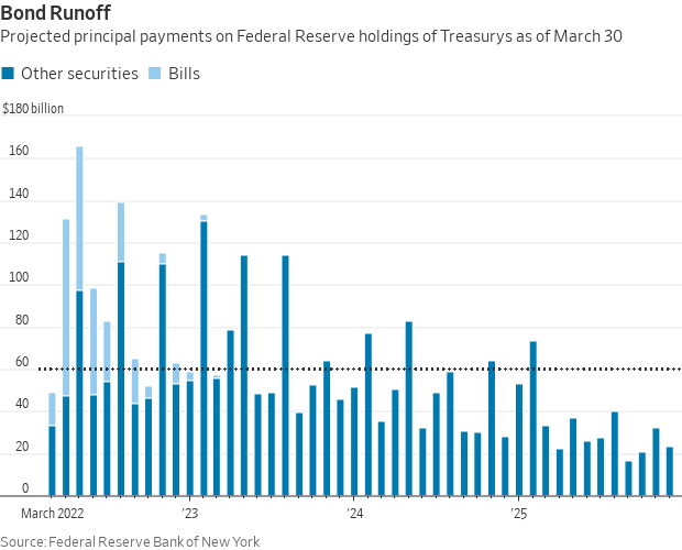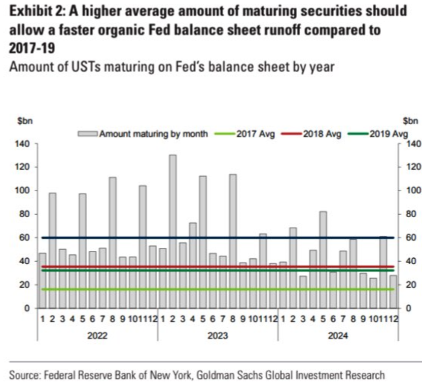 QT2のペースを規定するものとして世間が注目するマンスリー・キャップは毎月国債 60bn、MBS 35bnのペースに決まった。もちろんいきなりその額のRunoffが始まるわけではなく、2017~2019年のQT1と同じようにそのペースまで段階的に引き上げていく。計95bnという数字については前回の記事で「ブラードでさえQT2については「流動性を増やしてきた時と同じペースで減らせない理由はない」までしか述べておらず、それは月120bnの資産削減に翻訳されるものの、キャップがQT1の月50bnより著しく高いことはとっくに決まっており、今でも既に月100bnキャップ説が唱えられていることを考慮すると、QT2のペースについてはやはりそこまでブレる余地がない」としていたのに照らし合わせるとやはり大したサプライズがない。本ブログが何度も引用してきたGSの国債償還ペースのグラフなどは既に60bnのところに線が引いてある。