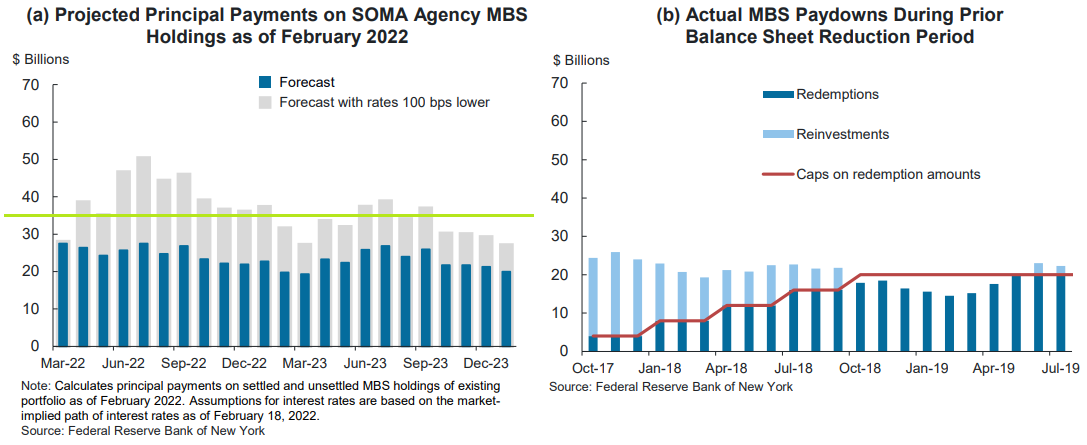 次にMBS。本ブログはかねてからRun offではMBSがSOMAポートフォリオから落ちるペースは遅いという問題意識を取り上げており、将来的にポートフォリオを米国債中心にしたいなら「再び将来におけるMBS売却の蓋然性は高まった」のでQT2をRun offと言い張る時間帯は終わったとしてきた。この論点については3月以降に長期金利が上昇したせいで更に状況が悪化している。つまり予想されるMBSの償還ペースが更に鈍りそうなのである。MBS(この場合RMBS, Residential Mortgage-Backed Security)の借り手のうち一定数は繰上げ償還(期限前償還、prepayment)を行うが、金利が低下した場合は新しい低金利ローンに借り換える傾向が著しい一方、市中金利が高騰すると「低金利で借りられてラッキー」となるので繰上げ償還を行う人が減る。借り手の期限前償還ペースはMBS自体の元本償還ペース変動にパススルーされる。金利が3月頭の水準より100bp低かった場合(上図左グレー)ならともかく、現状の金利水準ではFedが保有するMBSの元本償還は毎月35bnどころか30bnにも達しない。従って実はキャップをどちらに置いても変わらず、また参加者達ももちろんそれを承知している。その上でキャップは将来プリペイメントが加速した(つまり低金利局面が再びやってきた)場合のQT2自動加速を阻止するのに役立つだろうとされている。