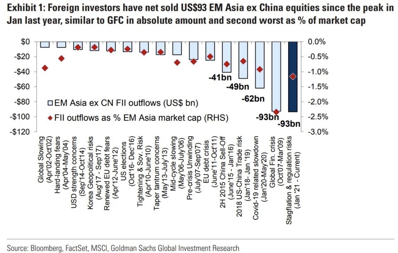 もっともGSとJPMのFCIを見ると米国に関してはまだまだ引き締まっていない。一方GSのグローバルFCIで見ると米国FCIより遥かにタイトであり、既に2015年のチャイナショックを遥かに上回る引締り方である。ユーロ圏やイギリスはそうでもないので、金融環境が悪化したのは主に新興国だろう。Fedが米国景気を見ながら行う金融引締めの効果が、米国より得てして経済が弱い米国外に派手に染み出すことは基軸通貨制の弊害として長らく議論されてきたが、今回も例外ではないと思われる。もっとも全部がFedのせいというわけではなく現地の指導者が悪い場合もあるだろうが、いずれにしろ米国景気が耐えている間は、と引締めを続けると米国以外で次々と爆発が起きる事態も想定され、その時には海外から米国債への逃避が起きるだろう。