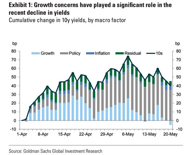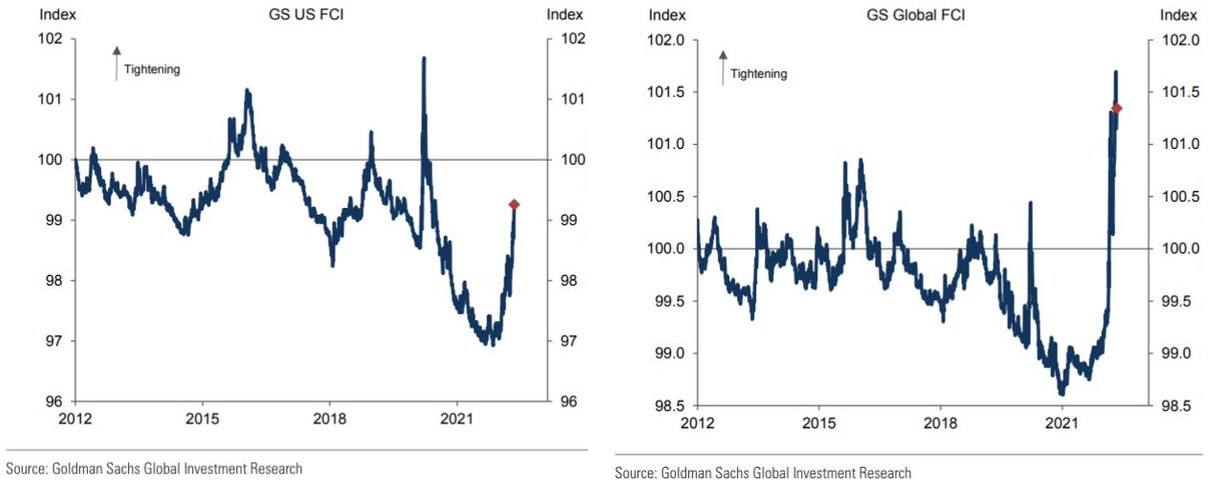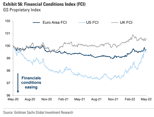 もっとも、そもそも論としてS&P 500はピークからは調整したものの、バリュエーションを見ても、FCIに入っている時価総額・GDP比を見ても金融政策に警告を発するレベルの調整にはなっていない。恐らく株価こそがFCIの中で最もルーズだろう。現に既に一度取り上げたことがある4月分のデータとなってしまうが、GS FCIを見ても明らかに他のコンポーネントが引き締まってきた中で「株だけが高い」からFCIが緩く見えたのである。従って皮肉なことにFedが株価「も」見ながら金融政策を考えている前提で、株価「だけ」は高いのでFedの政策転換を後押ししないのである。