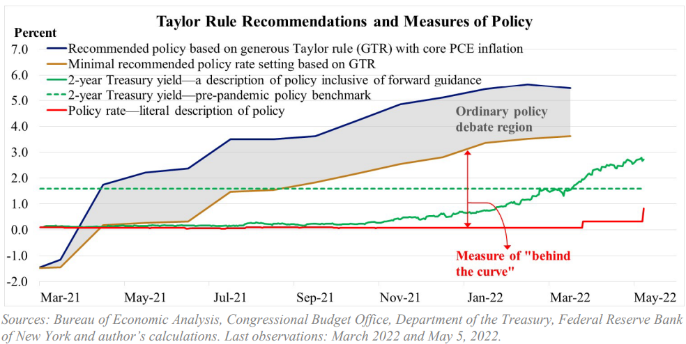 これまで散々予想可能性が重視されるだろうとしているQTのスケジュールは相変わらず動きようがない。短期金利市場は5, 6, 7月FOMCの50bp利上げを織り込んだ後に75bp利上げの織込みも一度進んだものの、5月FOMCでは50bp利上げが実現しつつ、75bp利上げについてはパウエル議長が「あまり積極的に議論されていない」とやや否定的に表現し、「今後数回の50bp利上げ」という表現に市場の見方を収斂させようとした形跡があるがこれを深読みすべきだろうか。今は最タカ派の目安と考えてよいとしていたブラード総裁も5月FOMCと4月分CPI発表の後、執行部が5月FOMCで匂わせたスケジュールに対して「今のところわれわれには適切な計画がある。想定も適切である」と珍しく批判を封じている。Fedの利上げが遅きを失したとする"Behind the curve"批判が盛り上がっており、ブラードはそちらへの言い訳にも追われている。「テイラールールと比べると利上げは遅れたが、2021年後半からFedは