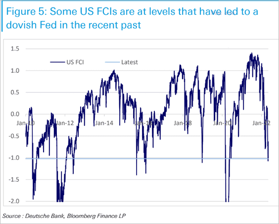 以前の記事でも重視したように、S&P 500の20%調整とUSIGの150bpは2018年末のクリスマスショックで付けてFedの利上げサイクルを挫折させた水準であり、今回はS&P 500の3850がそれに当たる。直近のUSIGスプレッドはちょうど150bp近辺にありS&P 500の調整幅とぴったり息が合っている。奇しくもDBのFCIも2018年年末や2015年年末など、Fedの利上げサイクルが減速や挫折を余儀なくされた場面と同じ水準に差し掛かっている。