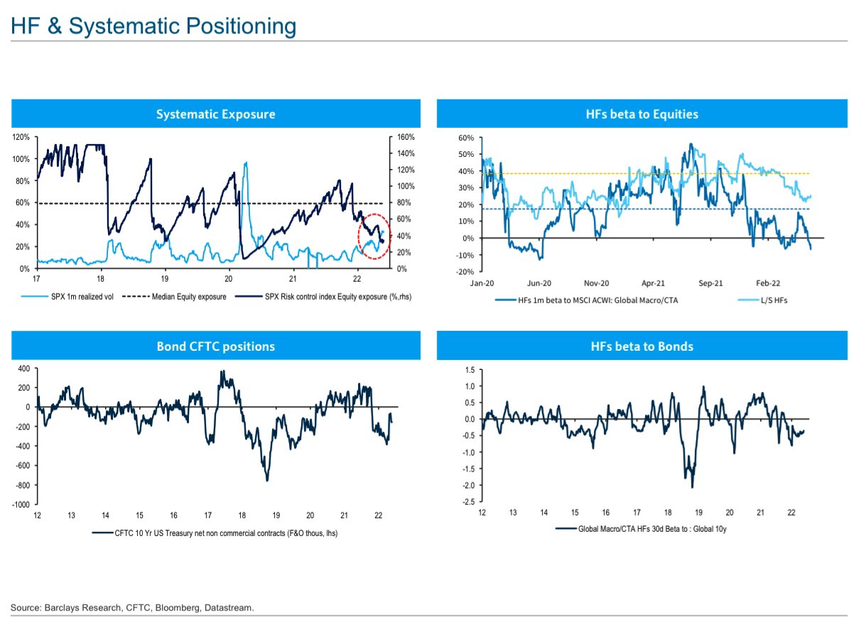 ポジショニングはトロント・ドミニオンとバークレイズのものが流れてきているが、いずれのチャートでもポジションが軽く、また買戻しには動いていない。バークレイズのリアライズドVolとの比較が買戻しが始まっていない背景の説明として分かりやすい。リアライズドVolの低下のみがシステマティック勢に上値を買わせることができるのは本ブログが繰り返してきた通りである。