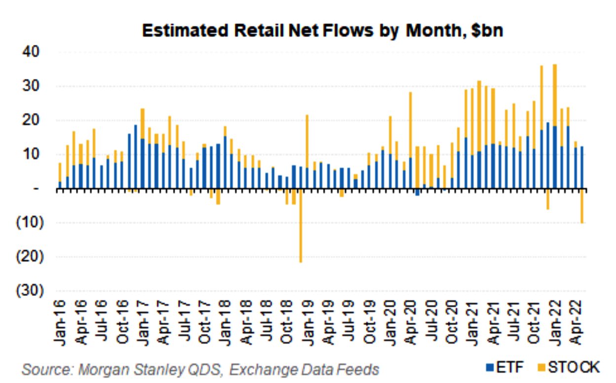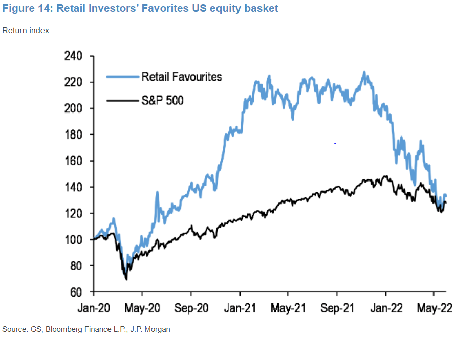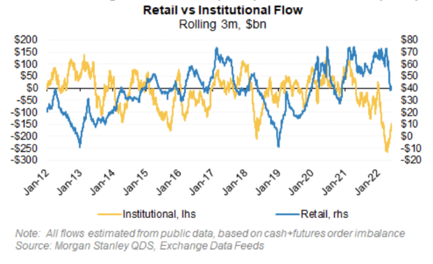 概して機関投資家のポジショニングが軽く復元するかしないかの議論をしてきた中、個人投資家がQTを前に一貫して売り続けている構図もこれまで何度も取り上げた通りである。減り続けたとはいえ個人と投資信託がまだ米株の半分を保有している中、彼らの売却フローに逆らうのは2020年に彼らの雑な買いに逆らうのと同じくらいきつい。自社株買いとシステマティック勢の買いでどこまで対抗できるかというところであり、前者は6月後半になるとブラックアウト期間に入ってしまう。