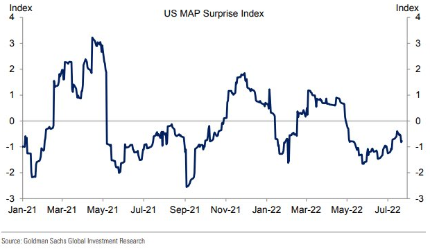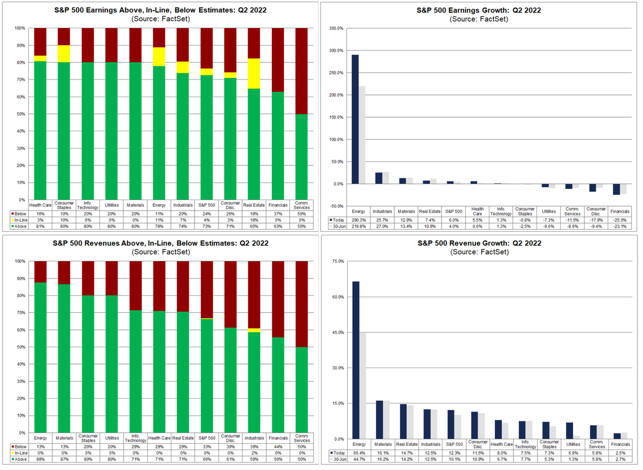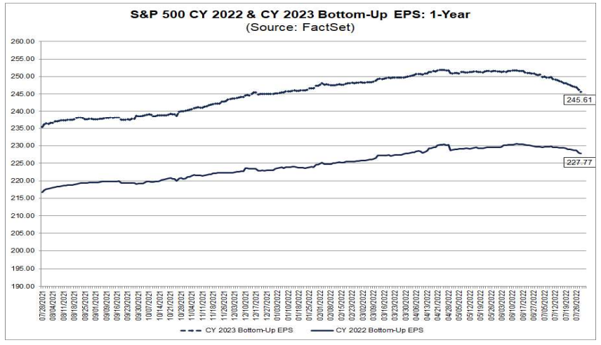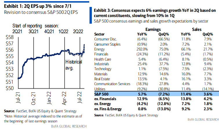 最もスリリングなGAFAMを含む半数以上のS&P 500企業は決算を通過した。EPSのビート率は73%と先週の68%より改善したものの5年平均の77%よりはまだ低く2020年Q1以来の低さとなる。ビート幅はさすがにかなりしょぼく、5年平均8.8%に対して3.1%となっている。2QのEPSコンセンサスは前年比+5.7%、エネルギーを除くと▲4.2%である。