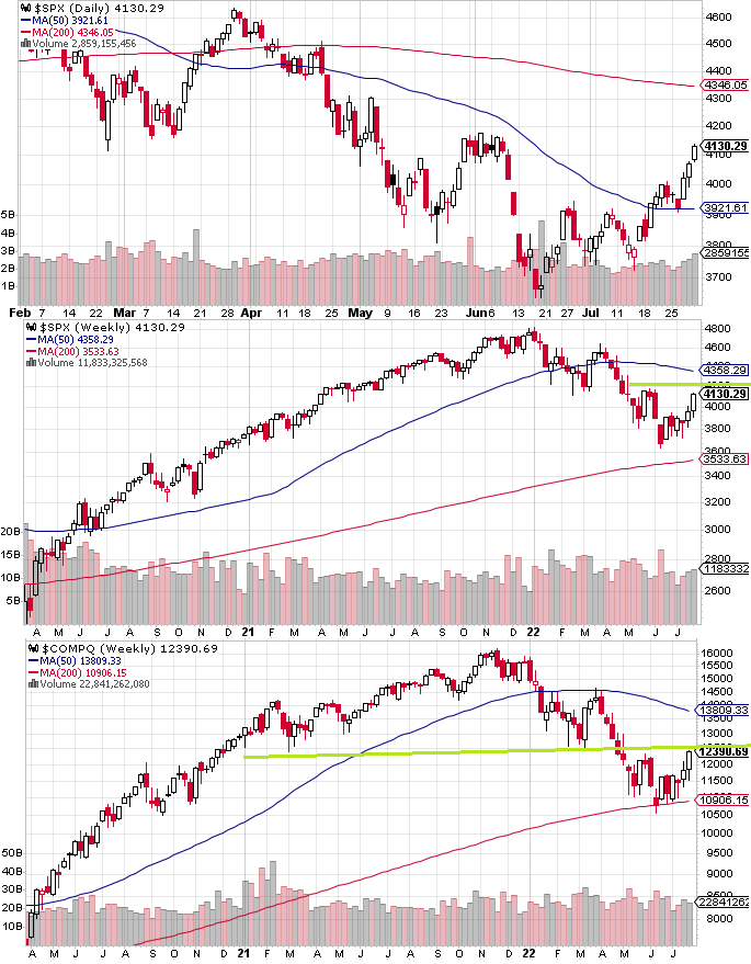 経済指標は総崩れで、IMFが世界経済成長率見通しを再び引き下げた。米国GDPは二期連続でマイナスということで簡易計算的にはリセッション入り(テクニカル・リセッション)したが反応は薄かった。PCEデフレーターもなかなかピークアウトしないがこちらも反応が薄かった。ガソリン価格などインフレが少し収まってきたのでミシガン大消費者信頼指数だけは少し改善した。