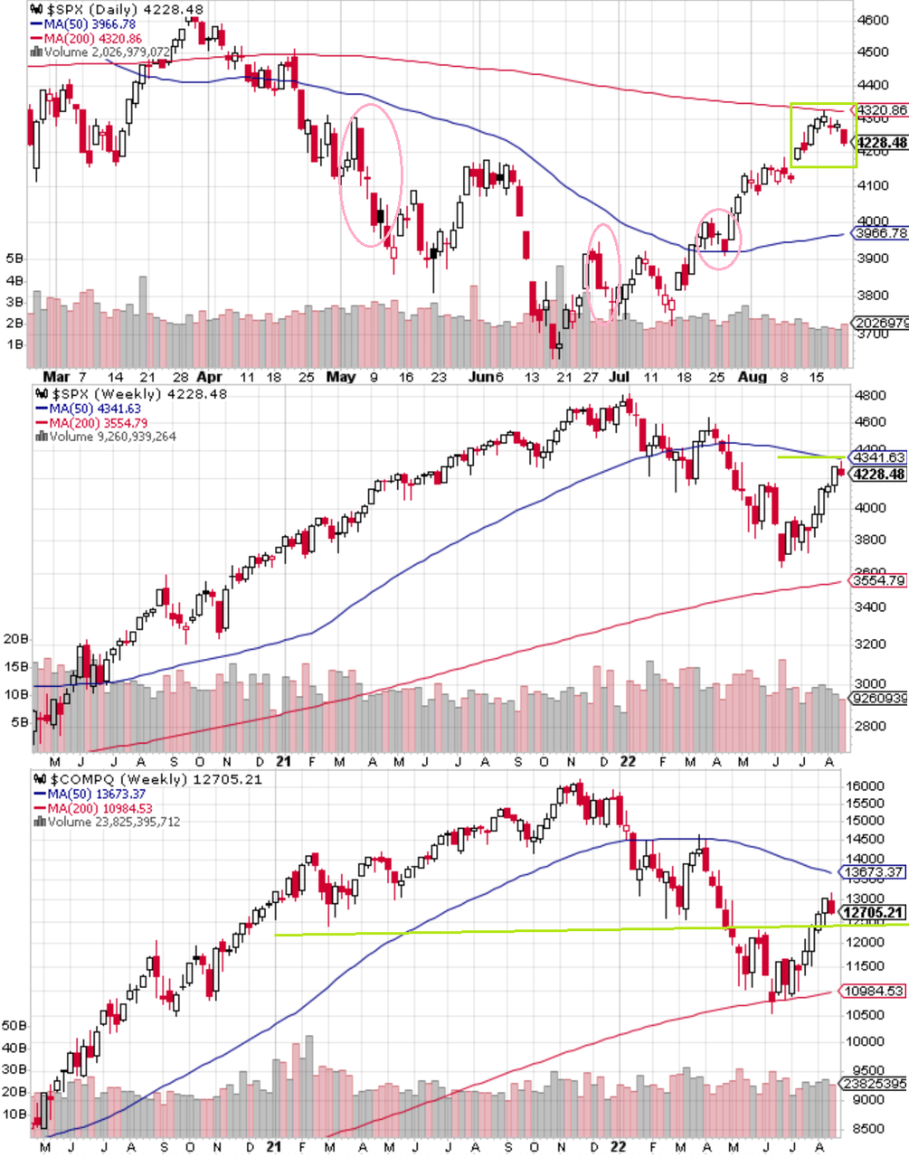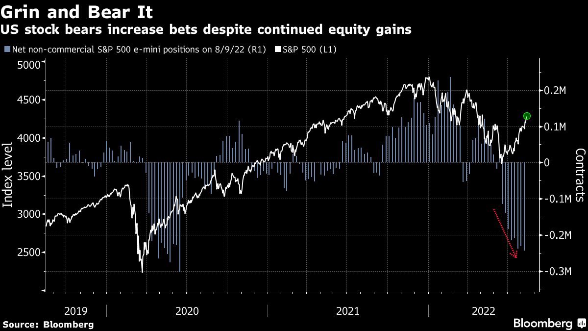 テクニカルには週足が上ヒゲ陰線となり、下ヒゲ陽線は4連続で終わった。4325は週足上ヒゲ、200SMA、週足50SMAが集まるレジスタンスとなり、4325の手前は売り場となる。何かの拍子で4200後半まで反発した場合、4325を背にした軽いショートを入れてもバチが当たらないだろう。一方で1本の週足をもって今サイクルの反発が終了したと判断するのも心もとないし、ポジショニングが依然ベア寄りであり、その投げられた玉が長期投資家に吸われた構図は短期的には変わりようがないので、前回の大クラッシュの二匹目のドジョウが来るとも期待しづらく、ショートはタクティカルなものに限られる。調整の下値目安は一直線に上がってきたので日柄よりは予想を立てづらく、CPIピークアウトを受けて4100近辺で窓を開けて上げ始めたわけであるが、それが非常に大きなテーマであり新規資金流入が相次ぐという構図になるなら4100近辺は最初のサポートになる。ナスダックではヘッドアンドショルダーのネックライン12500がそれに当たるがこちらはアンチ・ゴルディロックスに弱く、少し心もとない。割高なので4325をブレイクされた場合はさすがに(ショートの即時撤退以外は)かなり対処しづらいが、シーズナリティを考えて9月以降のどこかでは再び拾えると決め込んで寝て過ごすのは呑気すぎるだろうか。その時の対処のしづらさを考えると、クラッシュのたびに煽られたりせず軽く押し目を拾って行く必要性も残りそうである。