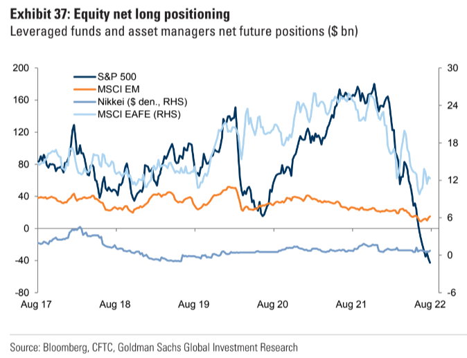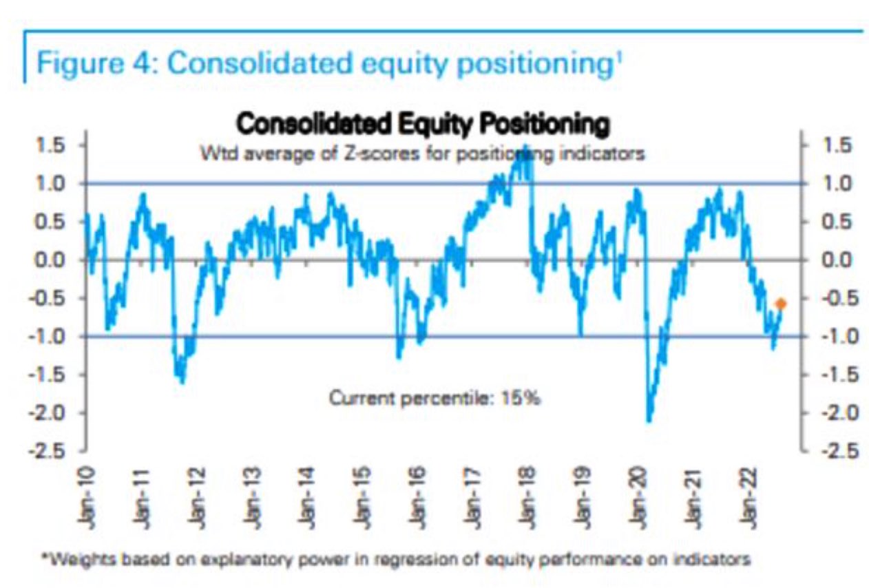 レバレッジファンドとAMの先物ポジショニングではS&P 500にヘッジが入り続けている。非商業主体全体のe-miniポジションも同様の傾向を示す。この傾向が前回見られたのはコロナショックの底から大きく反発した場面であり、恐らくそのショートは高値更新の燃料になった。なおその後ワクチンのニュースが出てきてショートが畳まれると指数は一時期逆に不安定に転じた。今回も似たような展開を辿るかどうかは分からないが、2015年パターンならショートカバーが済むと再び下値を試し、2020年パターンなら一旦大きなレンジを作ってから続伸ということで、どちらも上値を追いかけるオッズはよくない。2020年とは(インフレがピークアウトしたとはいえ)金融環境が異なる。金融環境が似ているのは本ブログが取り上げてきた2018年であり、この時もDB positioningで見ると積まれていたロングポジションがVIXショックで全て吹っ飛んでから軽いアンダーウェイトが踏まされ、その過程でS&P 500は鬼より怖い一文高値を付けた後2018年12月に向けて売り直されている。