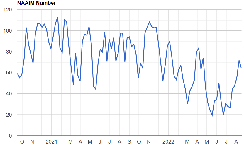 NAAIMは先週多少下がったもののやはり一時期よりは遥かに慎重であり、また値動き対比でも慎重である。ただ先週に続いてこの水準は買いの最もオッズがよかった時間帯は既に過ぎたことを示している。