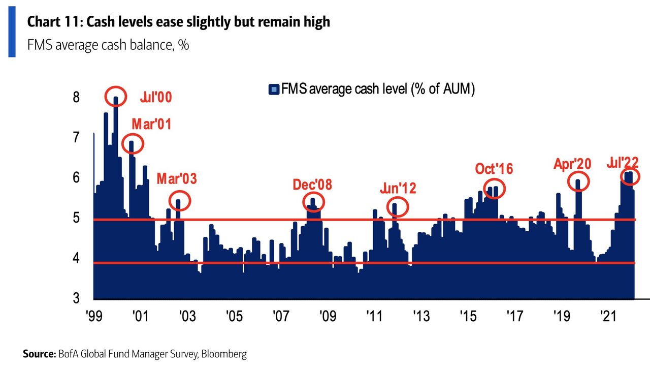 FMSのキャッシュはエクストリーム・ベアな6.1%から5.7%まで減少した。長期平均は4.8%なのでまだだいぶベアではある。