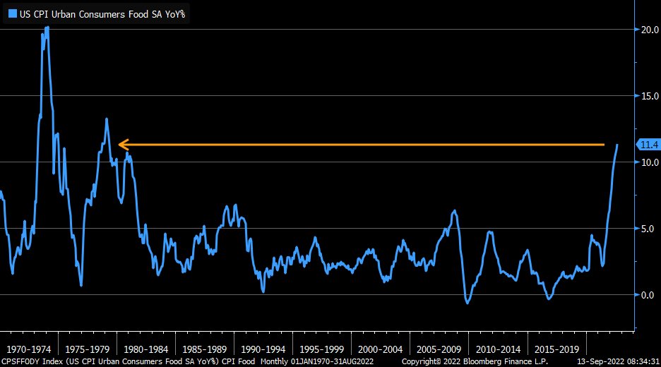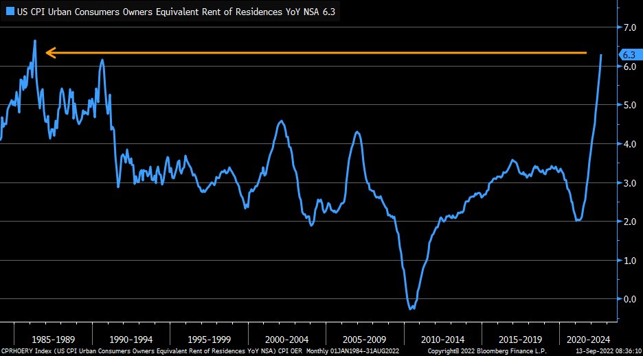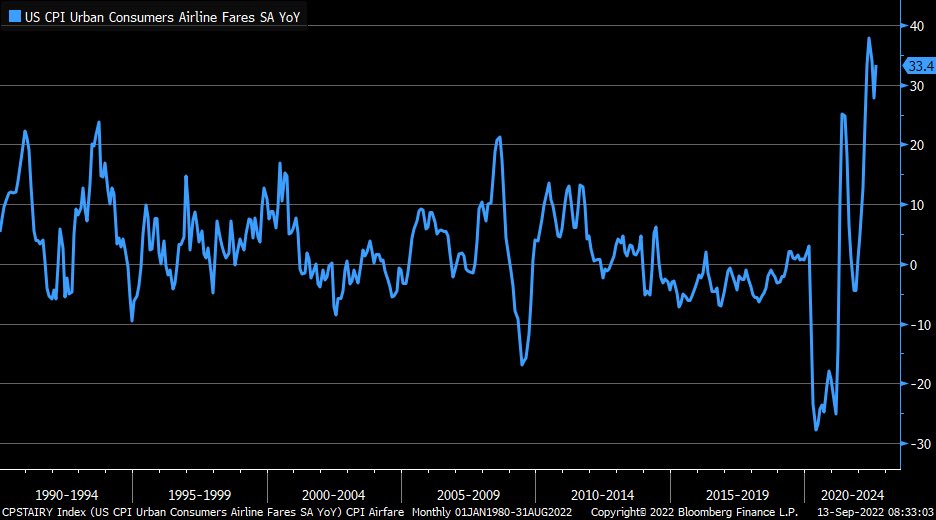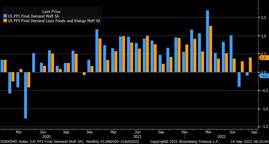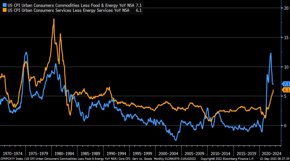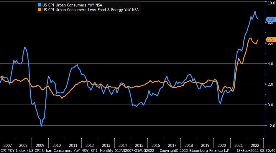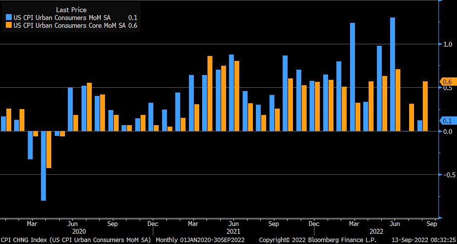 米国8月CPIの数字は再び市場をざわつかせた。ヘッドラインCPIは年率+8.5%から+8.3%へと大方の予想通りピークアウトの形を保っているが、コアCPIの高止まりが目立った。ヘッドラインCPIはコンセンサスの+8.1%より+0.2%と少し高かったものの、その乖離幅はそっくりコアの乖離(予想+6.1%、実績+6.3%)から来ている。