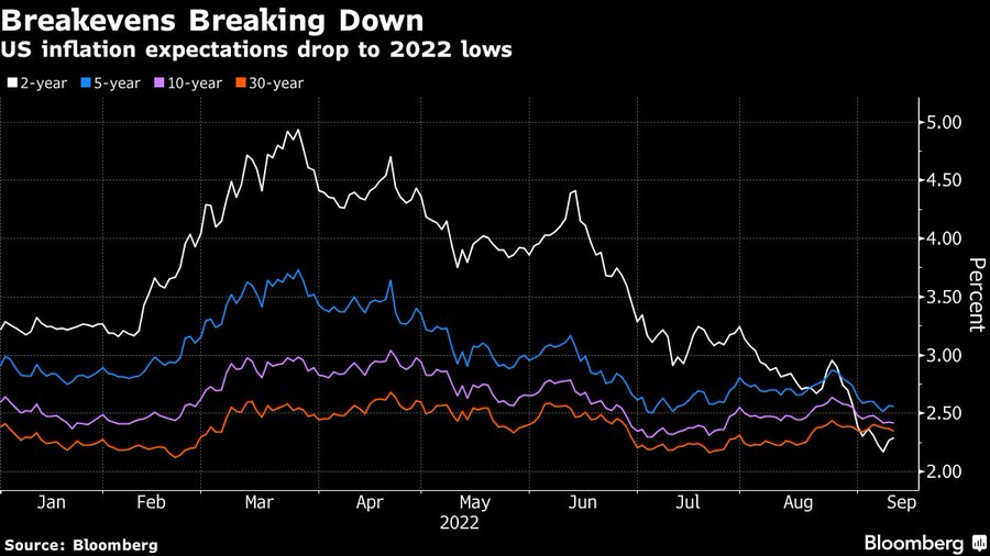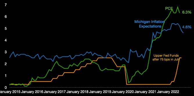 一方、エネルギーや消費財のインフレは収まっただけでなく、価格が上昇した翌年にはデフレ圧力に転じる。ピークを打ったエネルギーは原油価格が再び高騰しない限り、来年年央にかけて前年比でマイナスに作用する。これはBEI(市場ベースのインフレ期待)カーブに丁寧に表現されており、長期的なBEIが概ね安定している(つまりこれも今回のCPIを全く材料視していない)中、1年物や2年物だけが長期的なトレンドよりも下に一時的に潜る。エネルギーや消費財の価格下落が悪さしなくなった後、ヘッドライン・インフレは(緩慢にしか低下しない)コアインフレが規定する長期トレンドに向けて上昇、復帰するだろう。今後数ヶ月でヘッドラインCPIは粘着的なコアCPIを下に切ることになりそうである。恐らく来年中には4%すら遠いコアはともかく、ヘッドラインCPIは前年比2%近辺まで一時的に低下すると思われ、その時にもし株がクラッシュしていればFedは一転して利下げ圧力に晒されやすいだろう。