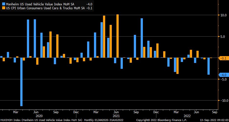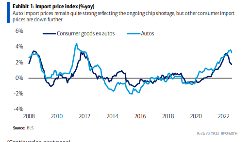 中古車はマンハイム中古車価格指数によると大きく値下がりしていてもおかしくないが、企業同士のオークション価格が消費者価格に波及するまでにタイムラグがあるのか、今回の統計ではほとんど出て来なかった。半導体不足が長引いているせいで自動車の輸入価格下落も他の消費財対比で一歩遅れている。もっとも過去を見るとマンハイムの方が先行してきたので、これからCPI中古車がマンハイムと逆方向に突っ走ることはないだろう。