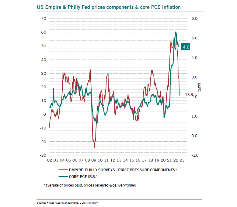一方、上流価格である生産者価格(PPI)は引続きピークアウトが明瞭である。これは供給制約の解消に伴うものであり、企業にとっての仕入れコストを低減させるものである。連銀の景況感サーベイの仕入れ価格でも同じ傾向が見られる、。