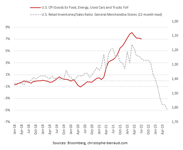 非常に大雑把に言えばインフレのコア化はインフレのコスト・プッシュからのデマンド・プル化でもあり、購買力がガソリン価格に食われるのではなく、サプライチェーン制約でコストが嵩むわけでもなく一般物価の上昇に引っ張られて販売価格が上がるなら企業にとってはフレンドリーなインフレに転換する。Fedの金融引締めの長期化を除けば、であるが。