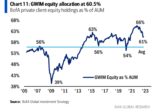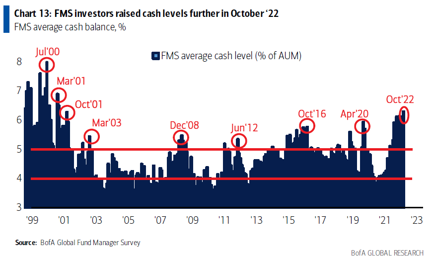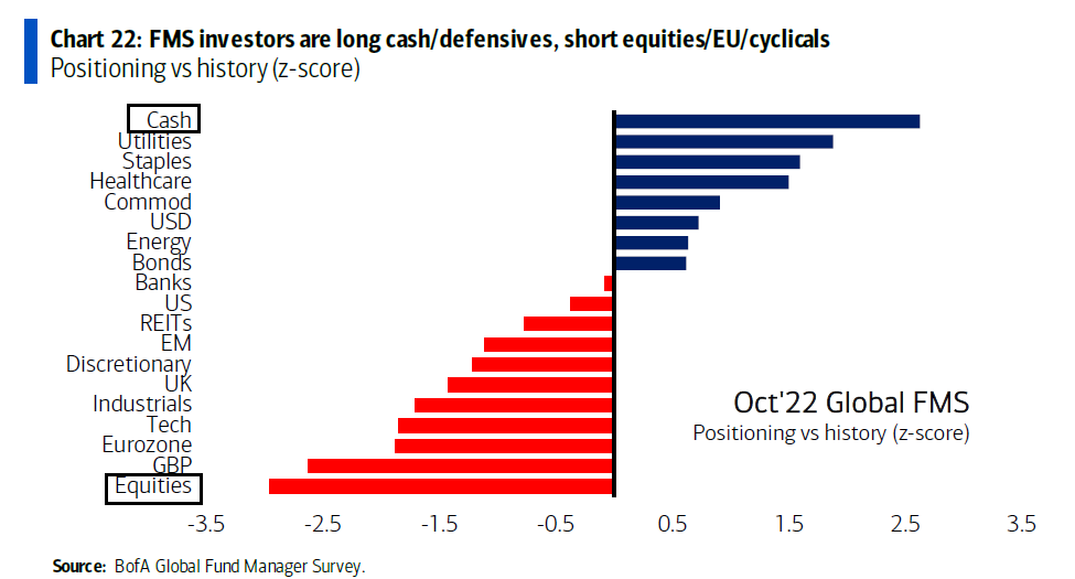 バンカメのFMサーベイのキャッシュレベルは6.3%と2001年以来の高さを記録した。もっともキャッシュにも年率3%の金利が付いており、それが年末には4%を超えるだろうから、2016年や2020年ほど居心地が悪いわけではないかもしれない。一方セクターでは相当ディフェンシブに寄っている。