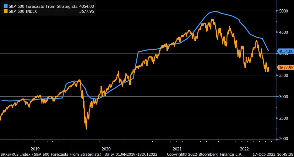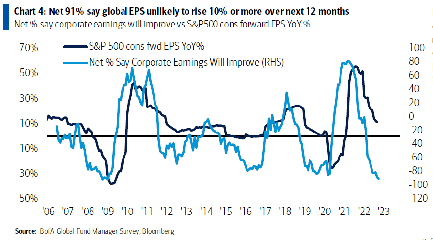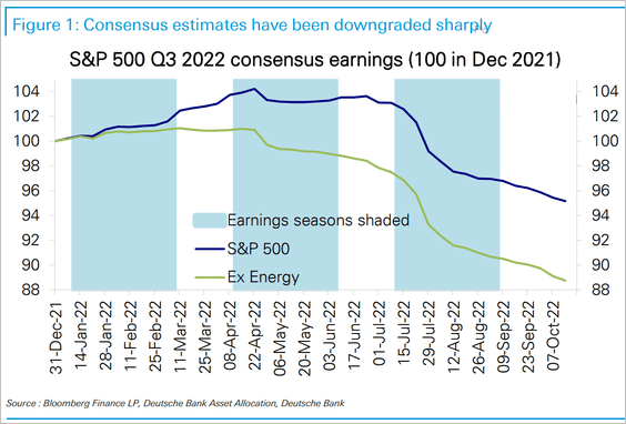 ボトムアップのフォワードEPSコンセンサスは徐々に低下してきており、そのトレンドは反転の兆しが見えない。従って指数の上昇は引続き金利低下に頼ることになる。一方、EPSのサーベイ結果はコンセンサスより更に期待が薄くなっている。またQ3のEPSコンセンサスは一時的なバブル下にあるエネルギーを除くと既に年初から10%以上下落しており、リセッションでも13~15%の下落と言われていたことを考えると決算ガチャは目線が低すぎて逆に滑るのが難しくなっている。