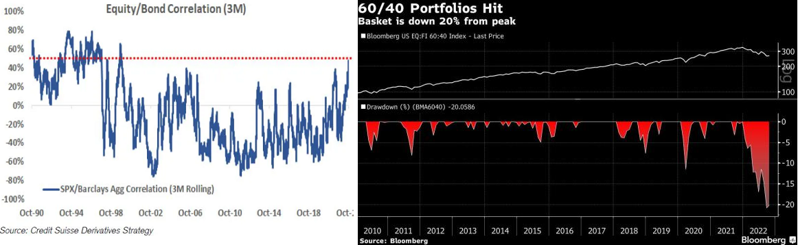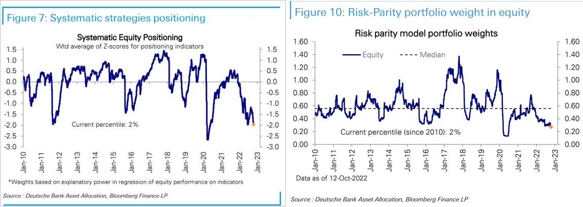 DBのシステマティック勢ポジショニングは一時ショートカバーしたものの、再び過去対比でマッシブ近くまでショート化が進んでいる。そして何年も存在感が薄かったリスクパリティのポジショニングがようやく流れて来たが、こちらの株ポジションは2%パーセンタイルまで圧縮されている。もっともこちらは(ウェイトはガチャガチャ変えているものの根本的なβ源である)債券と株式がインフレ・レジーム下で正相関に転じているので戦略としてワークしていないため仕方がない面もある。