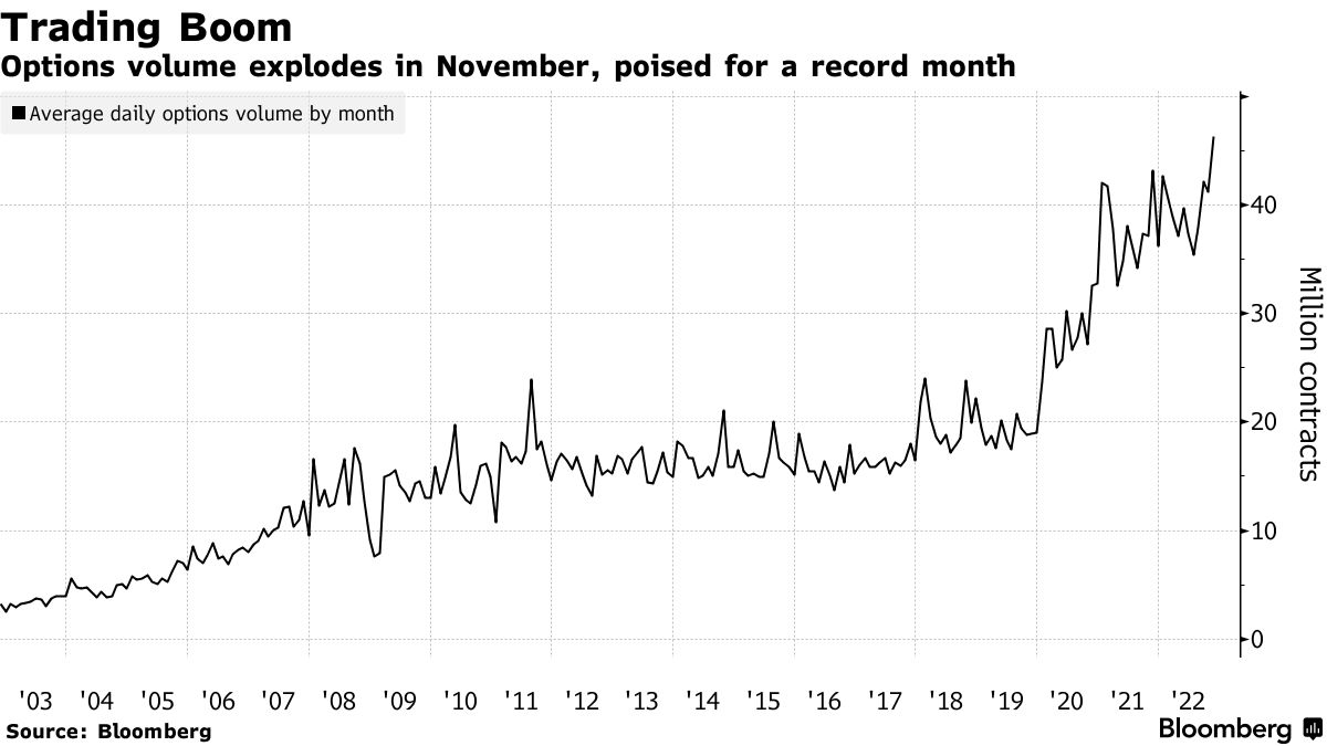 個人投資家も機関投資家も短期オプション取引に殺到しているためオプション取引のボリュームも増え続けており、その44%を24時間以内のオプションが占めるとGSは言う。