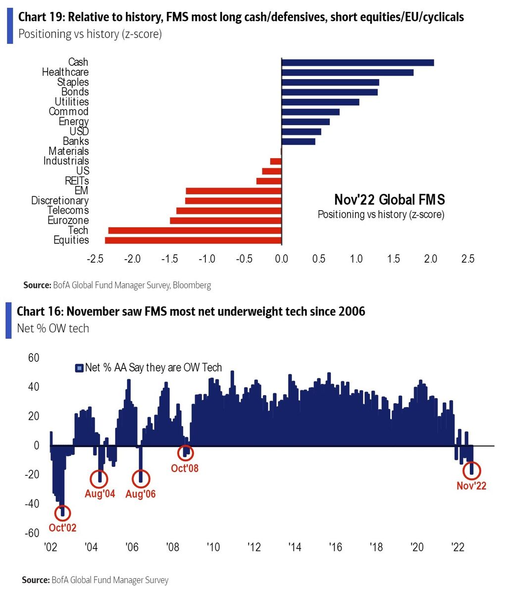 BofAのFMSはポジショニングがディフェンシブに寄っておりテックが過去対比でかなり軽い水準までアンダーウェイトになっていることを示す。もっとも2021年から断続的にアンダーウェイトではあったのだが、直近では更にそれが深まっている。代わりにオーバーウェイトとなっているのはディフェンシブである。