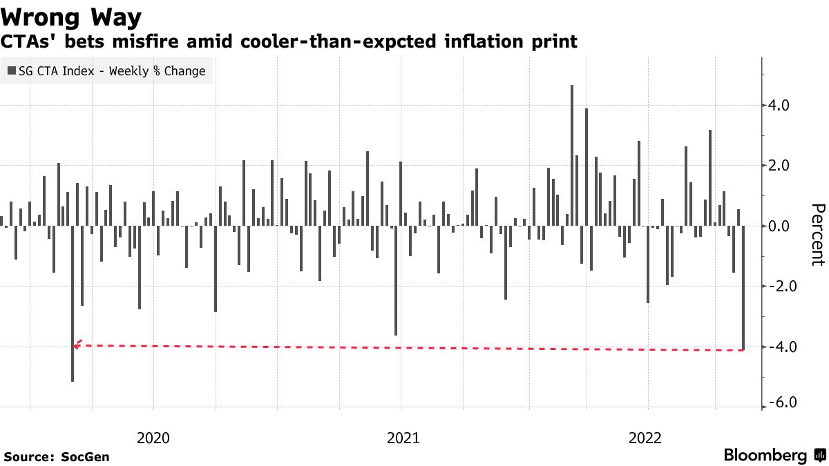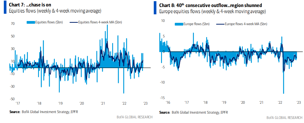 インフレの鈍化そのものは必ずしも企業収益に対してポジティブとは限らないが、とにかく金利が下がったのでバリュエーションは膨らみやすくなった。何よりもトレンドに追従する形で株と債券をアンダーウェイトにしてきたクオンツ系は両方同時に踏む。木、金の2日間でクオンツ系は推計2250億ドルの株と債券を買い戻したという。