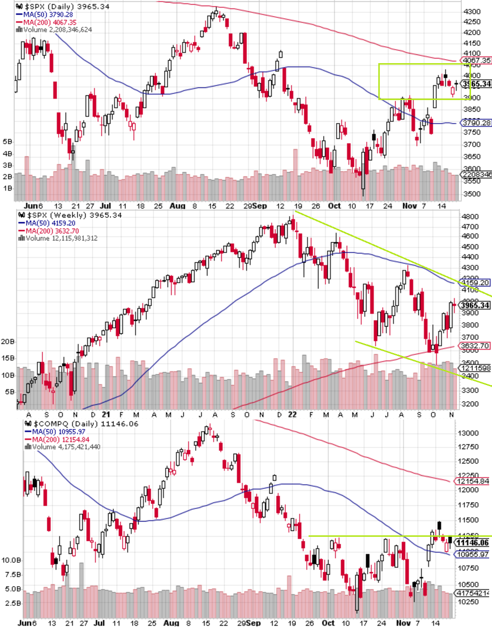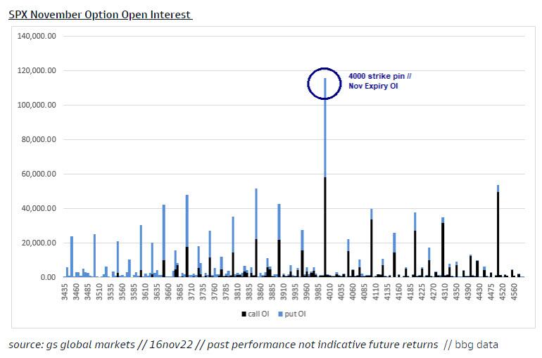 先週のS&P 500は米国PPIやポーランド領へのミサイル落下などのヘッドラインをこなして小動きとなった。先週の記事で述べた「CPIを受けて近い将来に再び急落して下値を更新するリスクは急速に剥落した。しかし上げも急速で雑なものだったのでS&P 500の3740にしろ、ナスダックの10250にしろ、サポートは軒並み遠くなっており、急いでレバレッジを上げて付いて行ったりすると調整でのドローダウンがまたアホらしく感じてしまう」雰囲気が市場参加者に共有されていたようである。少なくとも後述のOp Exまで「アップサイドがペイン」だったことは間違いなく、もしポーランドのヘッドラインがなかったらショートはPPIで切らされるところだっただろう。「景気を占ったり連想するのに使われそうな銘柄群」の決算ではTGTがまた滑り、HDが無難、でも小売売上高がそれらを打ち消した。