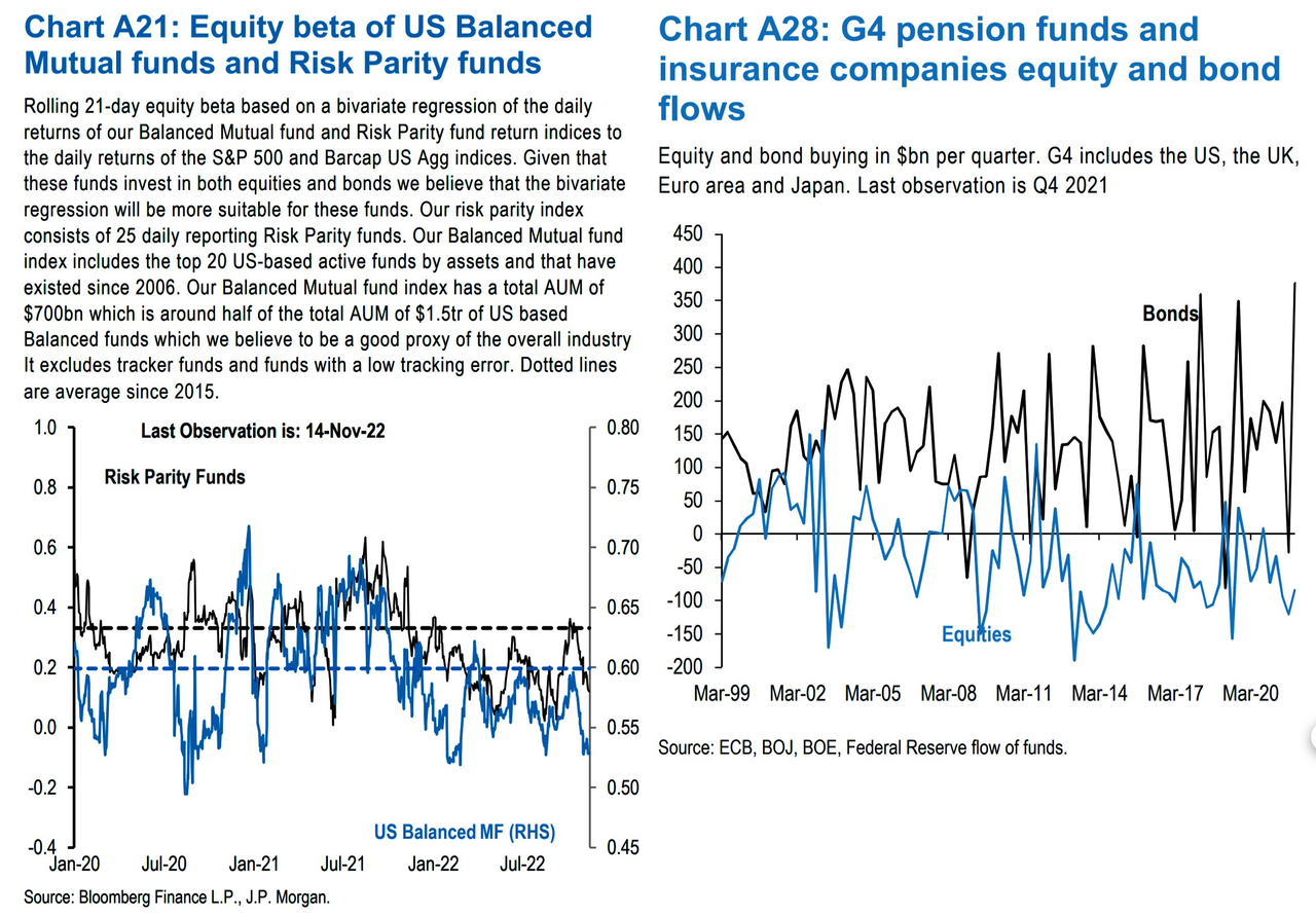 JPMによるとリスクパリティやバランス系ファンドの株式βは依然抑制されている。骨である60:40戦略がワークしていないので残当である。